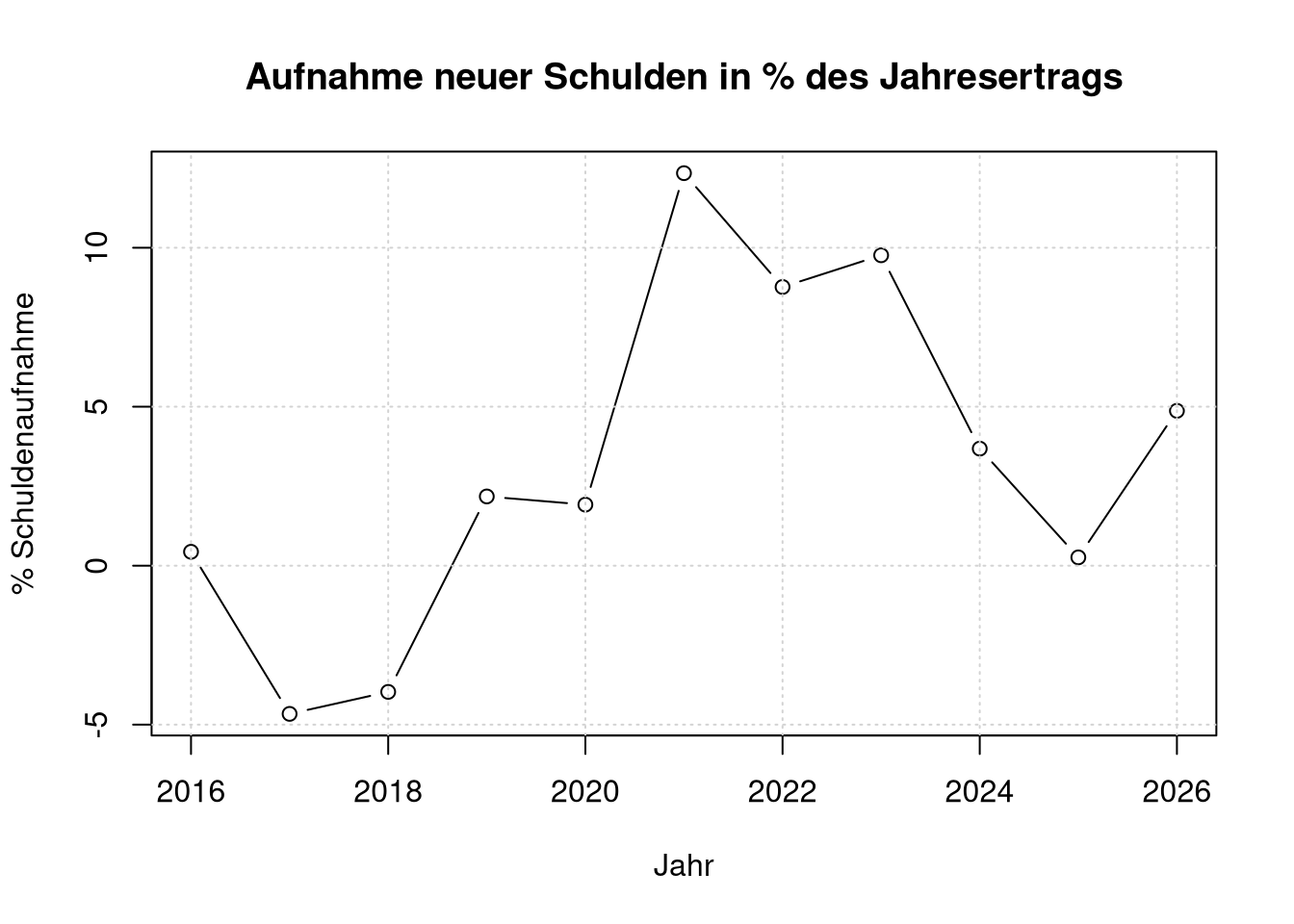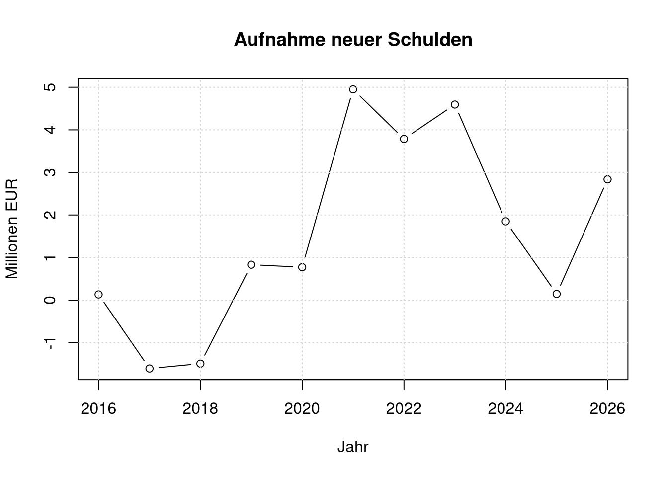 Der Plot zeichnet den Schuldenstand jeweils am Anfang eines Jahres. D.h. z.B. der Kringel bei 2024 gibt den Schuldenstand zum 31.12.2023 an. Der Wert für Anfang 2025 ist die Planung nach dem Haushalt 2024.