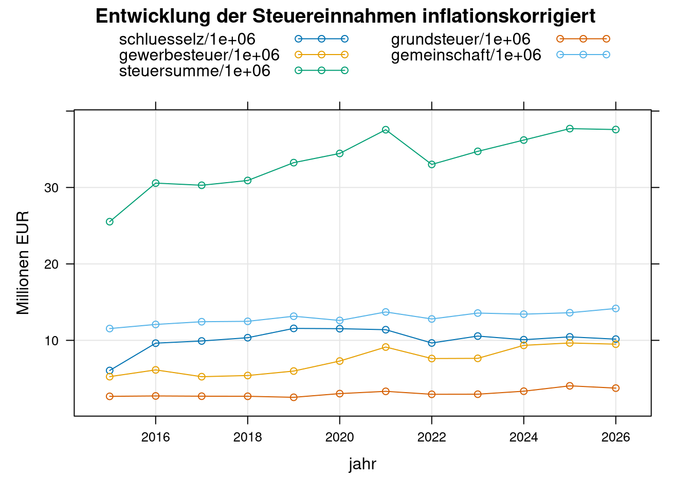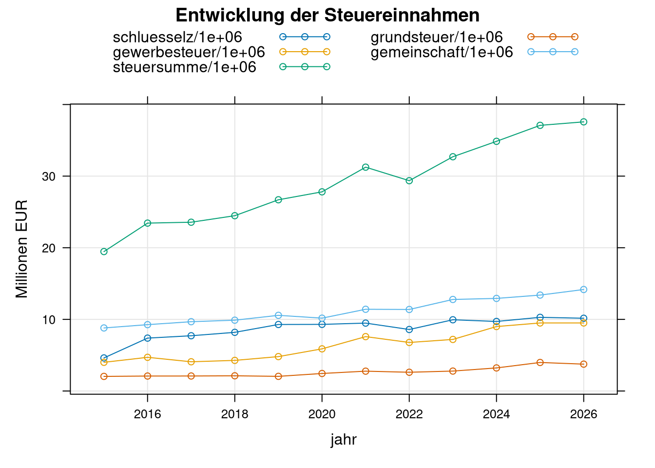 s <- rbind(data.frame(jahr=e$jahr, mio=e$gewerbesteuer/1e6, type='1Gewerbesteuer'),