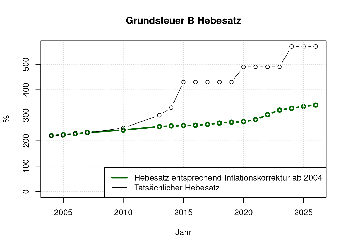 legend=c("Hebesatz entsprechend Inflationskorrektur ab 2004", "Tatsächlicher Hebesatz"),