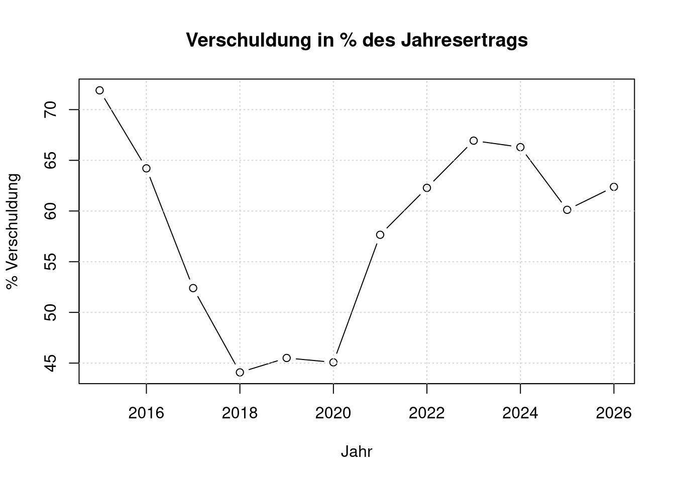 Der Plot zeichnet den Schuldenstand jeweils am Anfang eines Jahres. D.h. z.B. der Kringel bei 2024 gibt den Schuldenstand zum 31.12.2023 an. Der Wert für Anfang 2025 ist die Planung nach dem Haushalt 2024.
