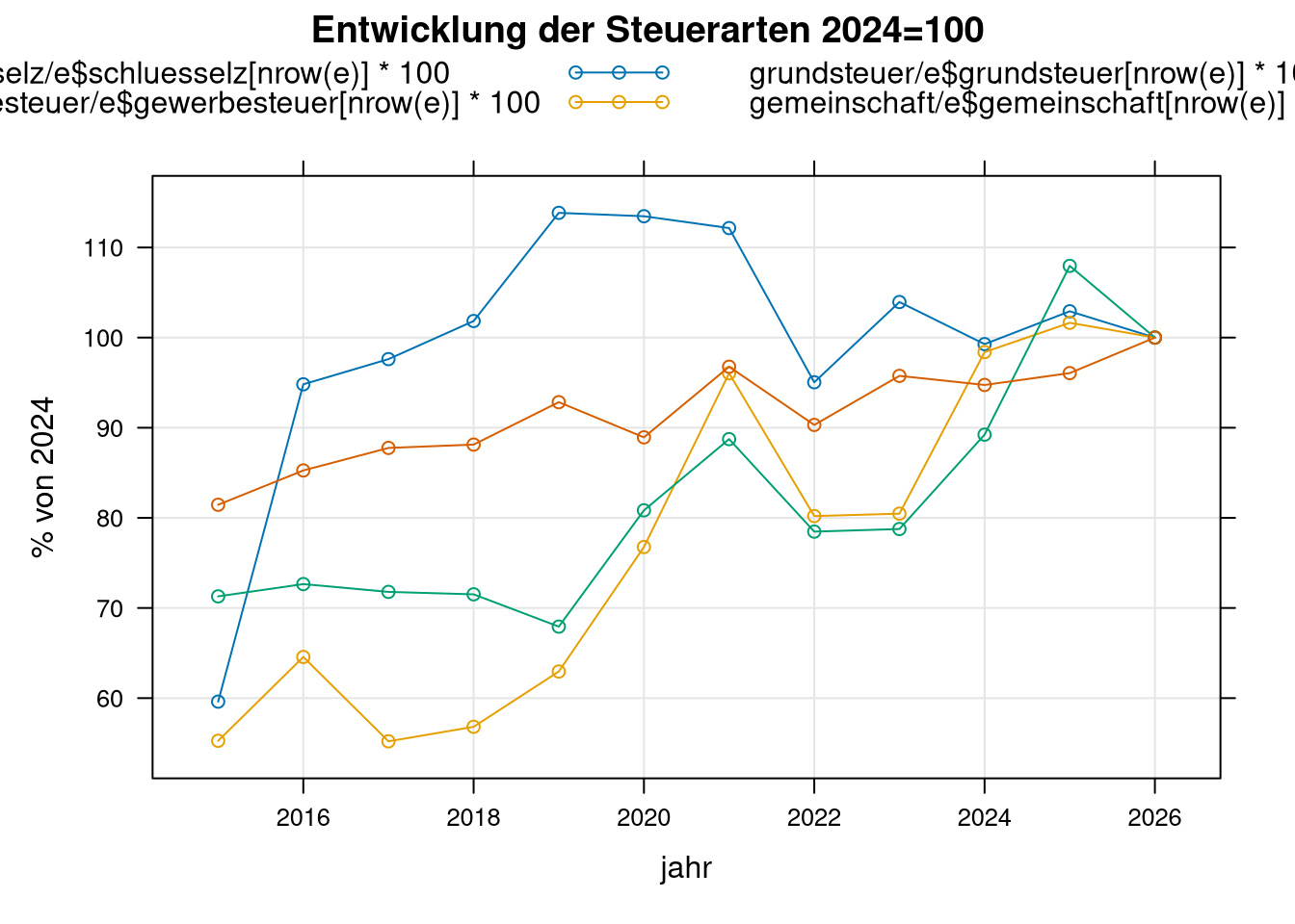 main="Entwicklung der Steuerarten 2024=100",