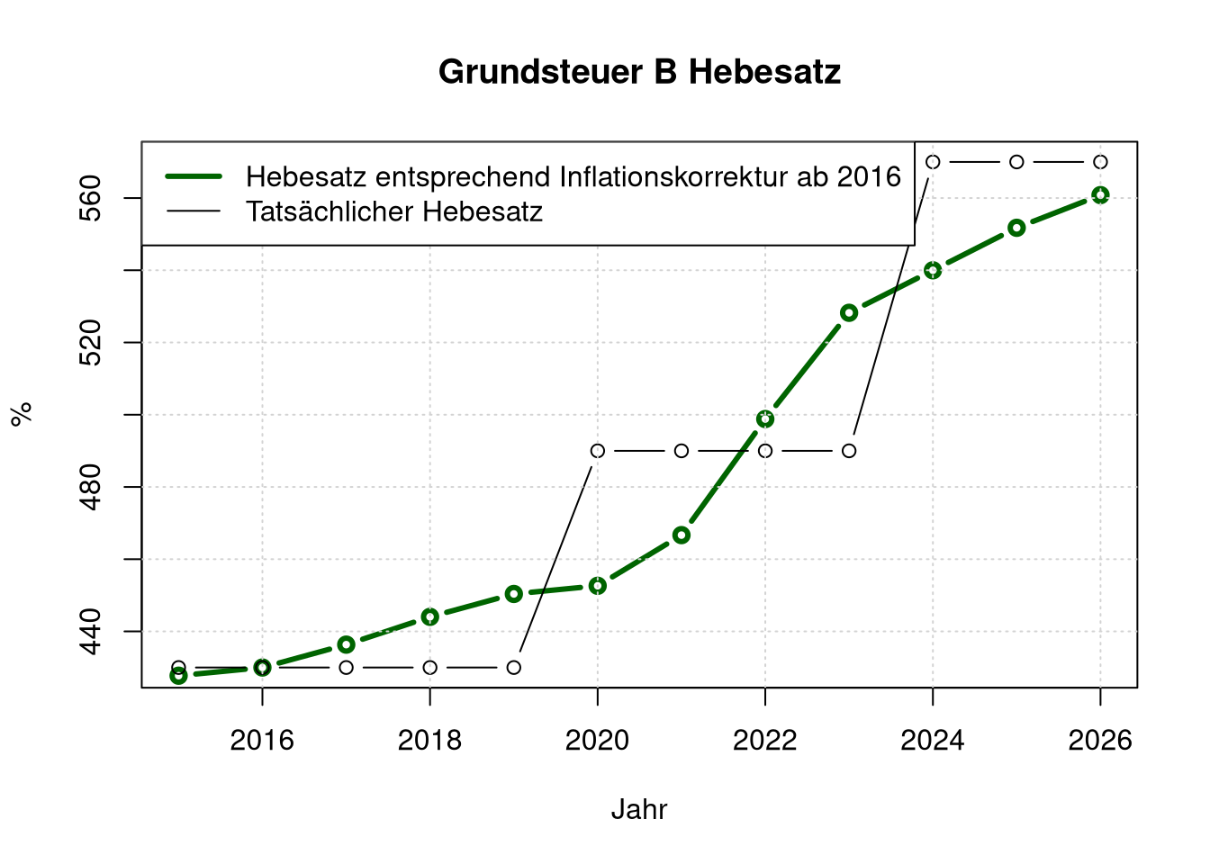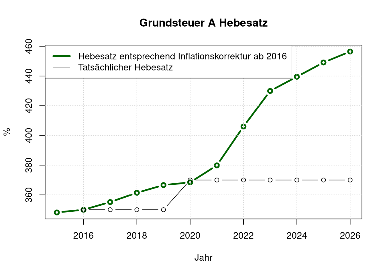 legend=c("Hebesatz entsprechend Inflationskorrektur ab 2016", "Tatsächlicher Hebesatz"),